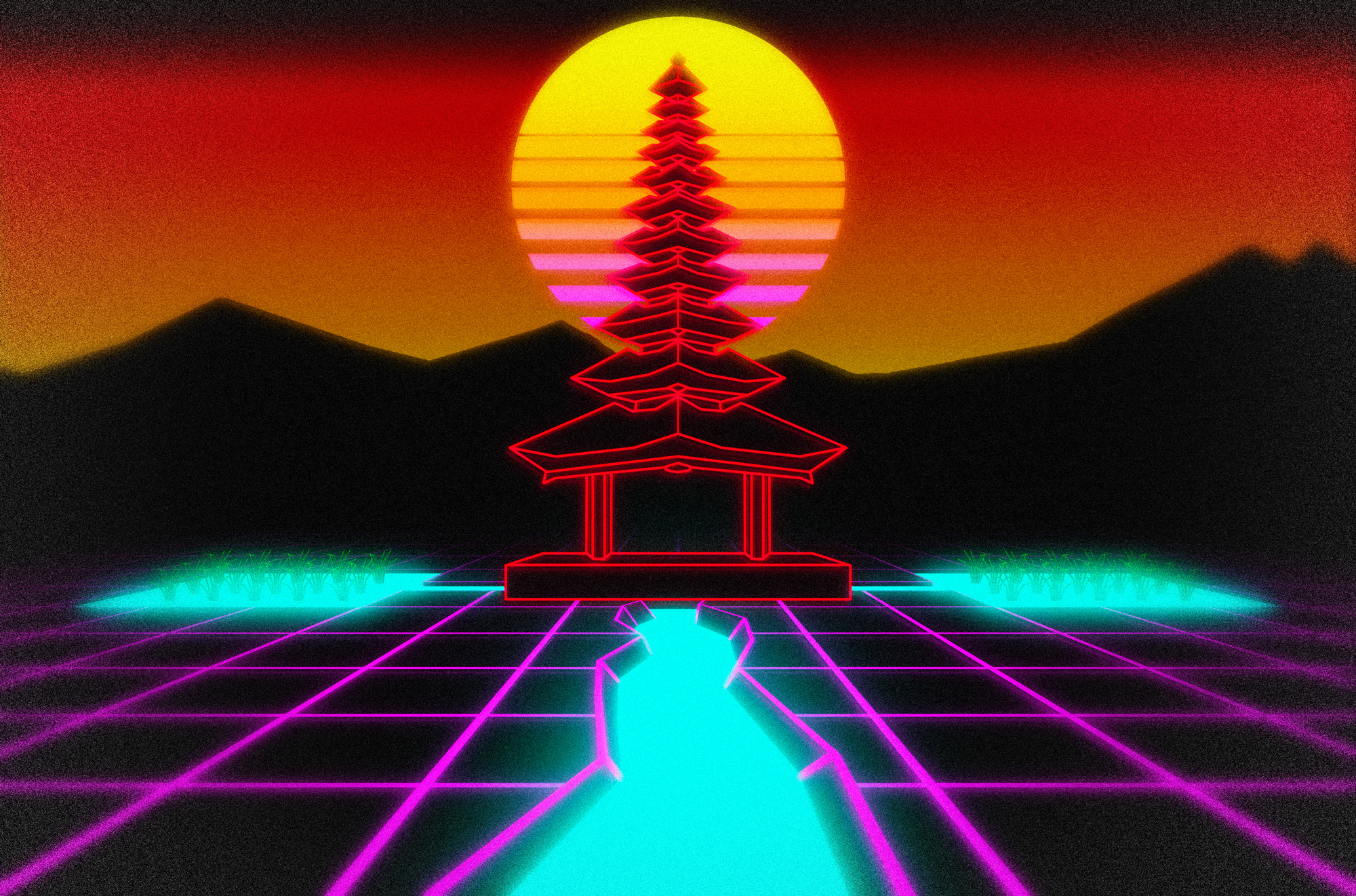 A stylized retro representation of a “water temple” in Bali, created for the article The Ancient Order of Bali.